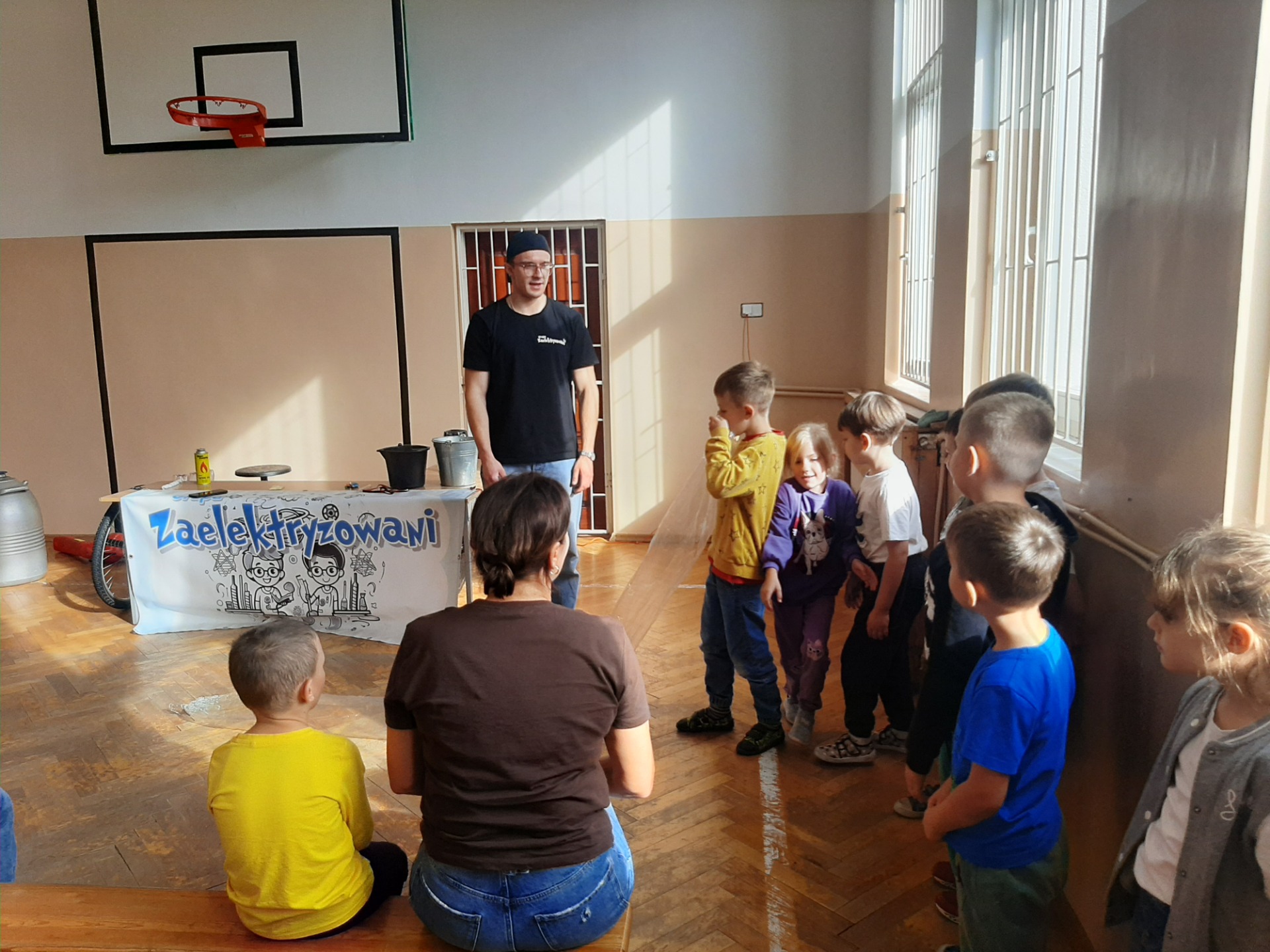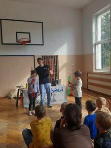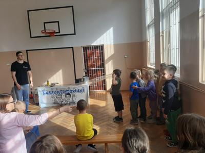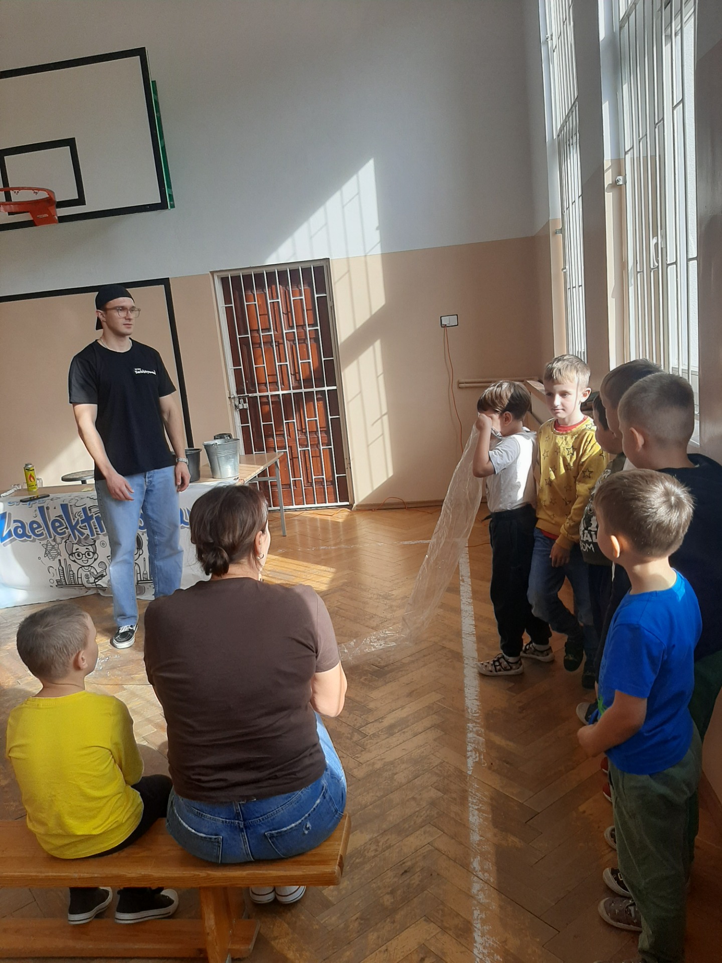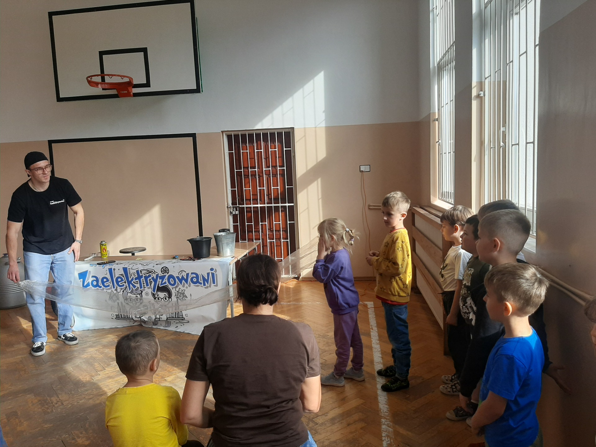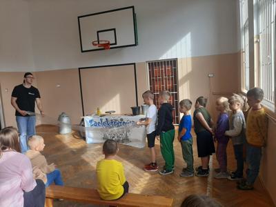 Dzisiejszego dnia -22 września naszą szkołę odwiedziła grupa o nazwie ,,Zelektryzowani’’. Prowadzący zajęcia w ciekawy i atrakcyjny sposób przybliżył naszym uczniom tajniki chemii i fizyki. W pokazie wzięli udział uczniowie klas 0 - 8. Podczas tej niecodziennej lekcji zostały im zaprezentowane widowiskowe eksperymenty i doświadczenia naukowe. Wśród nich znalazły się: lewitująca piłka przy użyciu dmuchawy do liści, czy też- ,,płonąca dłoń’’. Dzięki różnorodnym rekwizytom i substancjom uczniowie mogli poczuć się jak w prawdziwym laboratorium. Dużą atrakcją dla naszych uczniów była możliwość aktywnego uczestnictwa w pokazie. Co ważne prowadzący zwracali uwagę na kwestię bezpieczeństwa podczas pokazu oraz przestrzegali przed niepowtarzaniem doświadczeń w warunkach domowych.