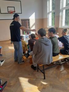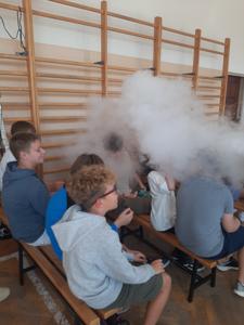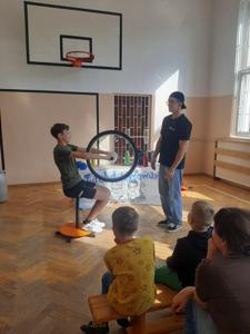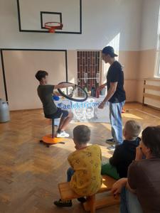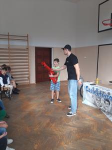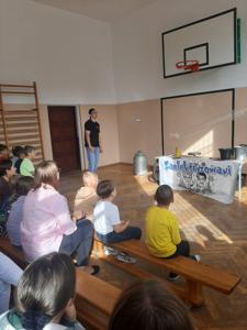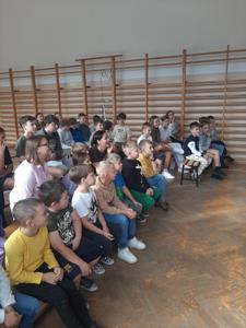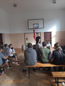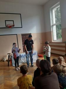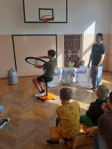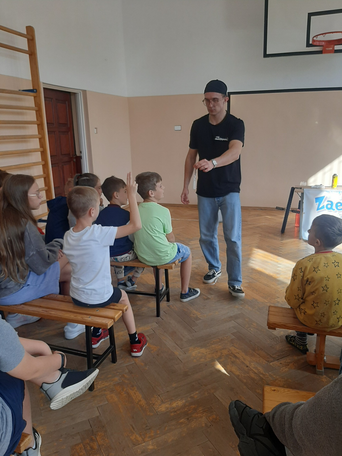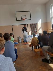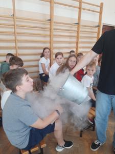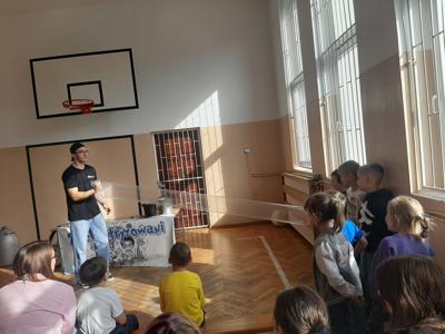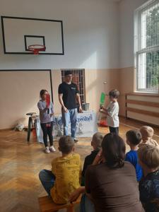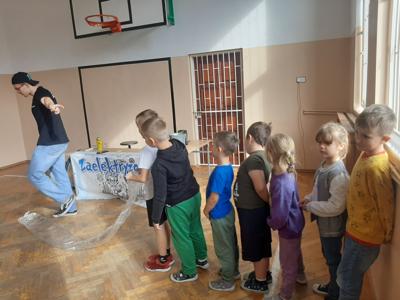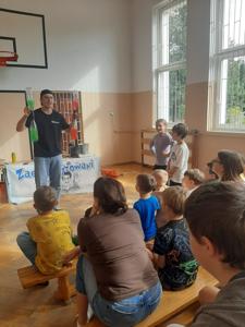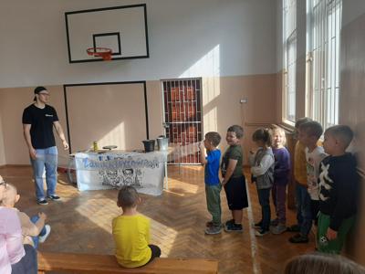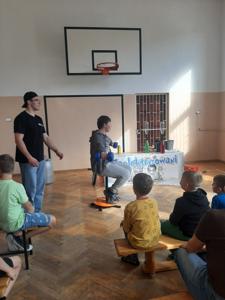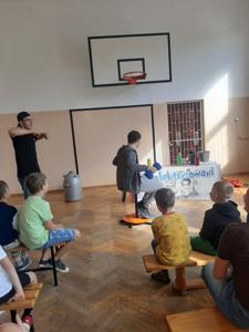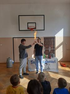 Dzisiejszego dnia -22 września naszą szkołę odwiedziła grupa o nazwie ,,Zelektryzowani’’. Prowadzący zajęcia w ciekawy i atrakcyjny sposób przybliżył naszym uczniom tajniki chemii i fizyki. W pokazie wzięli udział uczniowie klas 0 - 8. Podczas tej niecodziennej lekcji zostały im zaprezentowane widowiskowe eksperymenty i doświadczenia naukowe. Wśród nich znalazły się: lewitująca piłka przy użyciu dmuchawy do liści, czy też- ,,płonąca dłoń’’. Dzięki różnorodnym rekwizytom i substancjom uczniowie mogli poczuć się jak w prawdziwym laboratorium. Dużą atrakcją dla naszych uczniów była możliwość aktywnego uczestnictwa w pokazie. Co ważne prowadzący zwracali uwagę na kwestię bezpieczeństwa podczas pokazu oraz przestrzegali przed niepowtarzaniem doświadczeń w warunkach domowych.