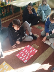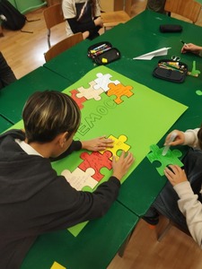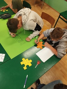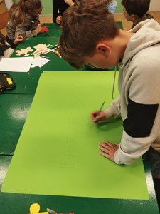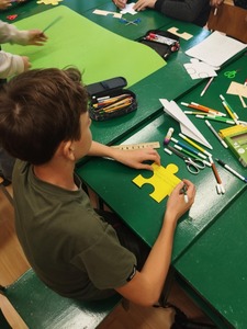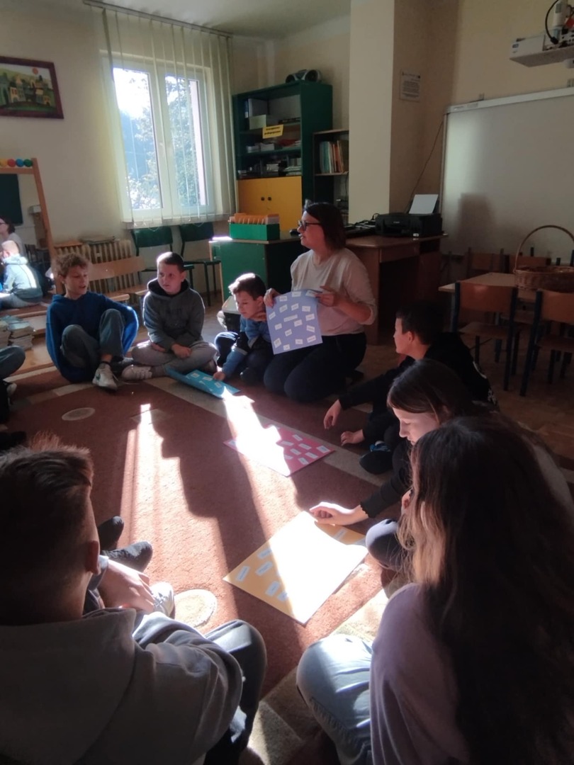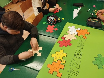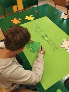 Natomiast uczniowie z klas VI–VIII wzięli udział w warsztatach utrwalających ich wiedzę na temat przemocy rówieśniczej. Podczas zajęć wspólnie stworzyli wspaniały plakat, który w atrakcyjny sposób przedstawia posiadane przez nich informacje o przemocy rówieśniczej – od jej rozpoznawania po skuteczne sposoby reagowania i udzielania wsparcia.