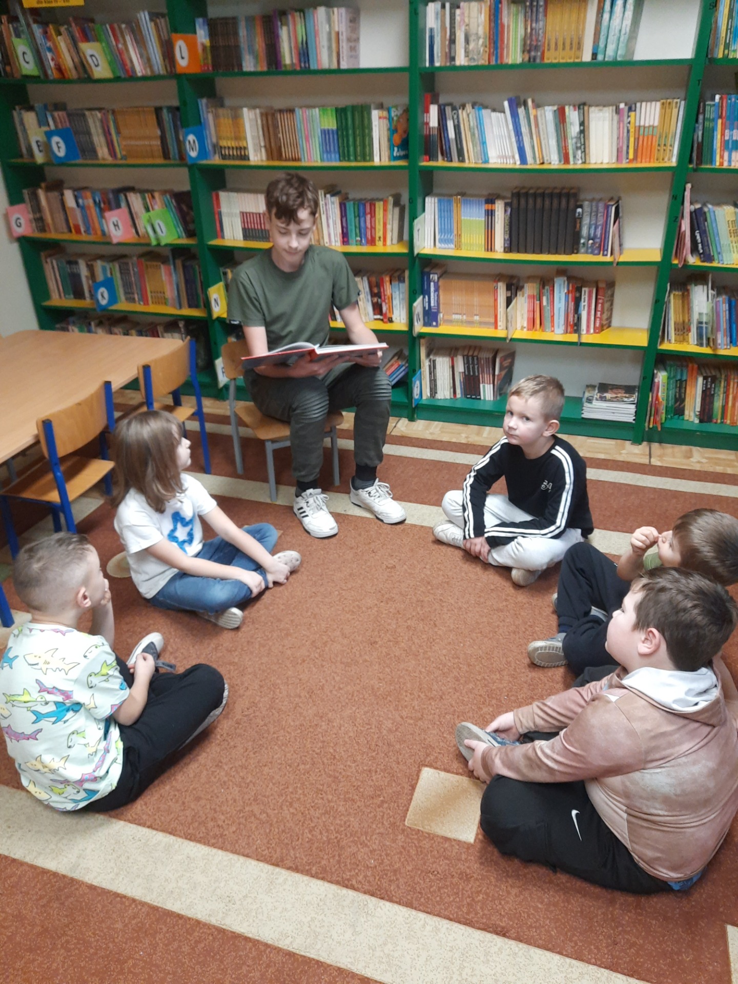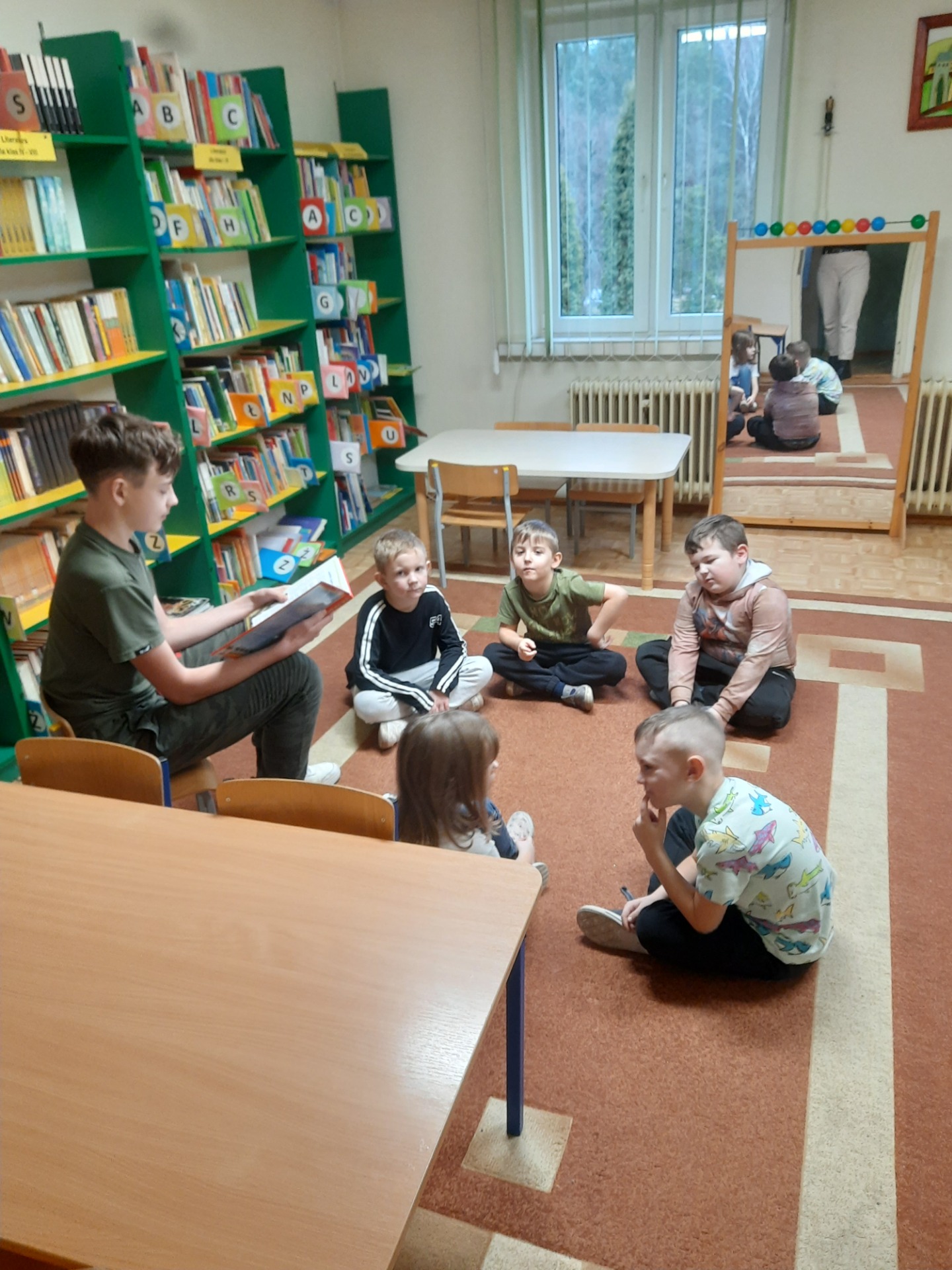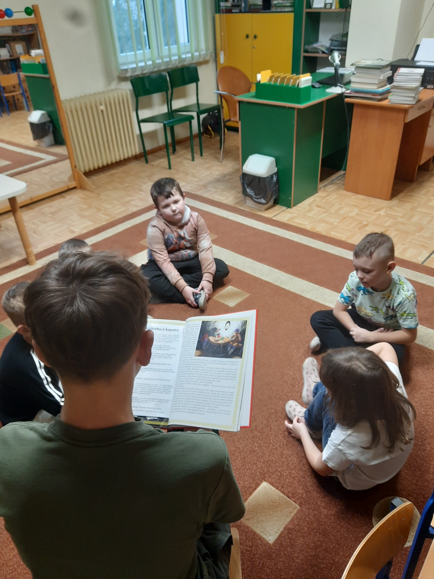 Kolejny zaczytany czwartek. To już 10 spotkanie. W dniu dzisiejszym Filip - uczeń klasy VIII czytał dziciom legendę o Skarbniku z kopalni. Skrabek bo i tak go nazywano był władcą podziemnej krainy, do której zabierał górników ginących podczas pracy. To postać przychylna ludziom, pomagał uczciwym i pracowitym górnikom jednak karał tych leniwych i nierozważnych ludzi pod ziemią ...