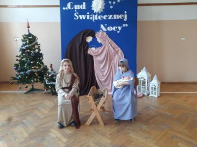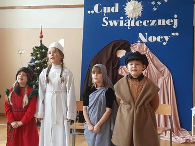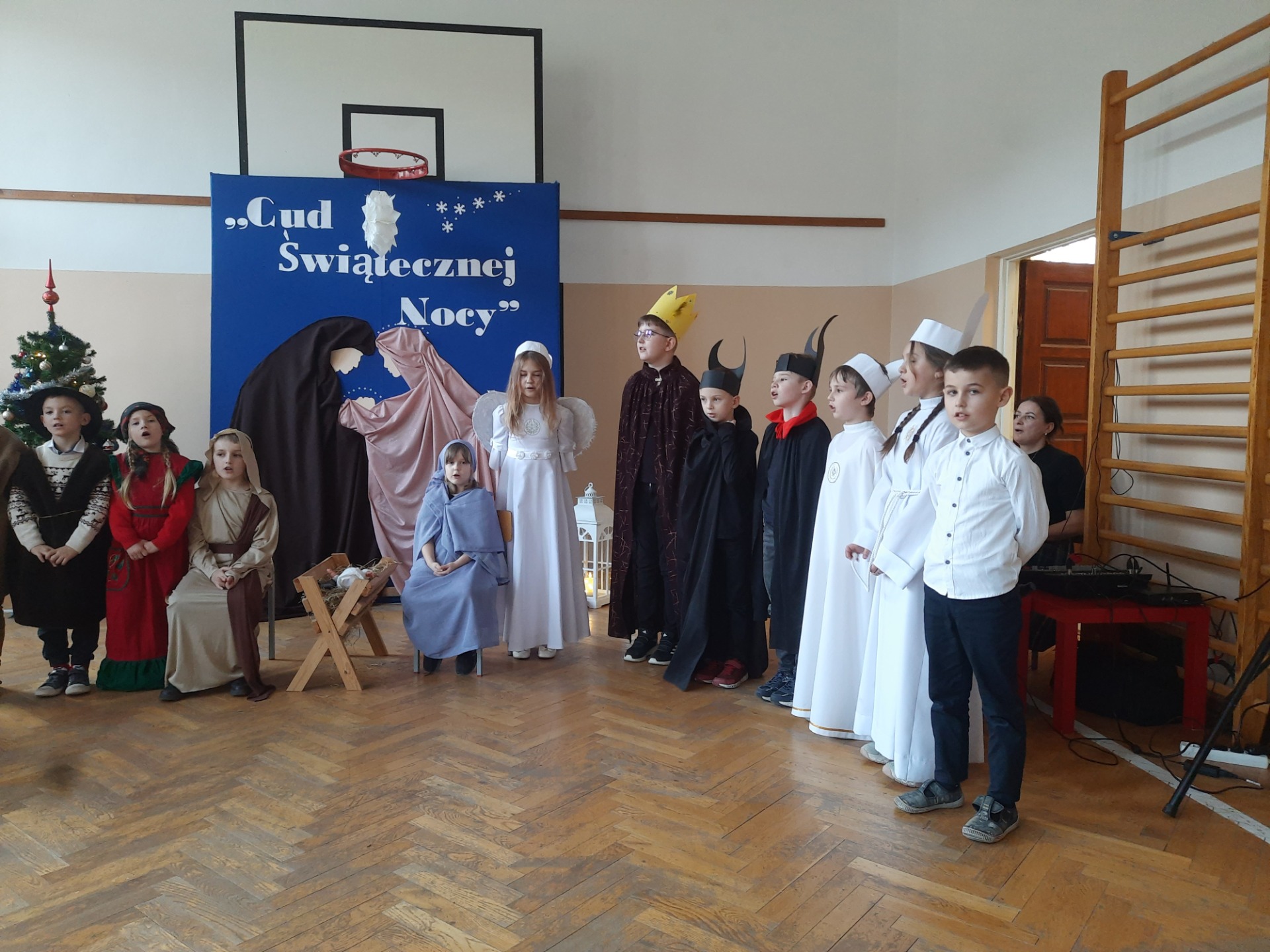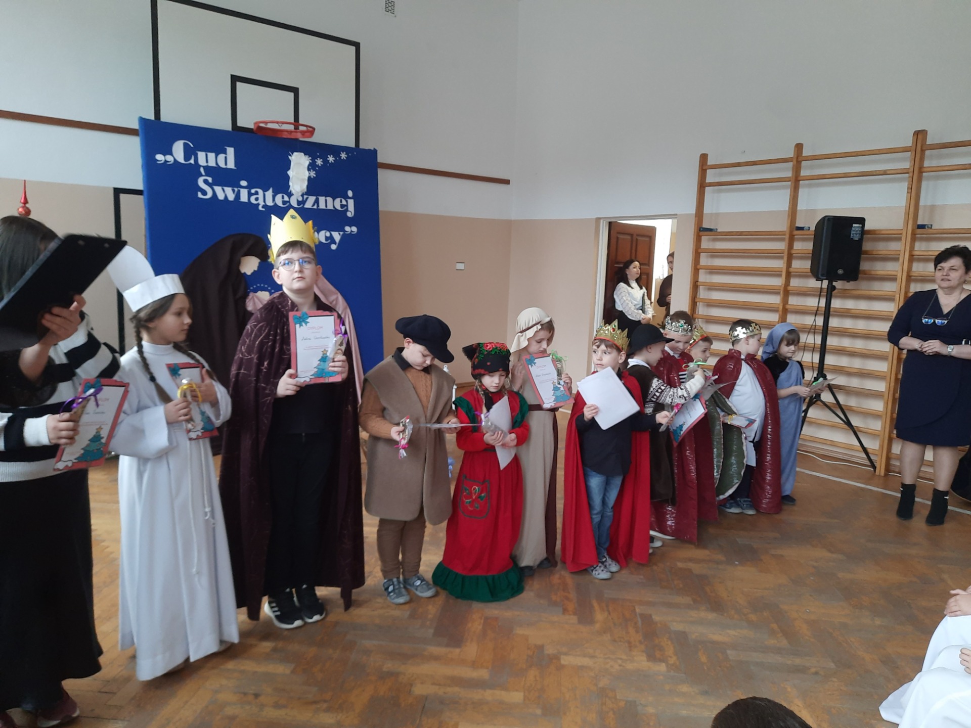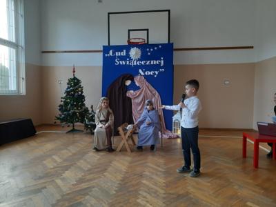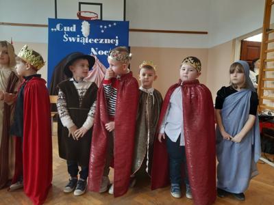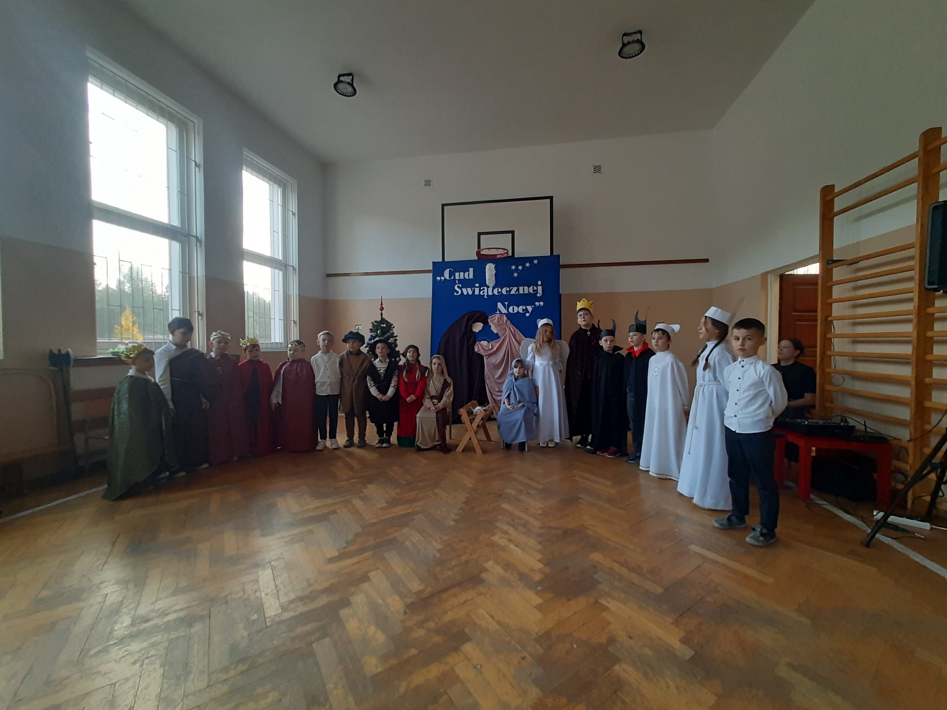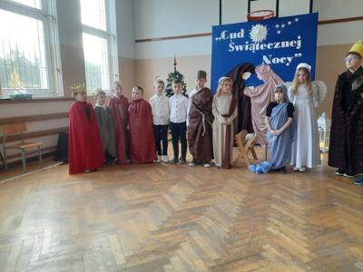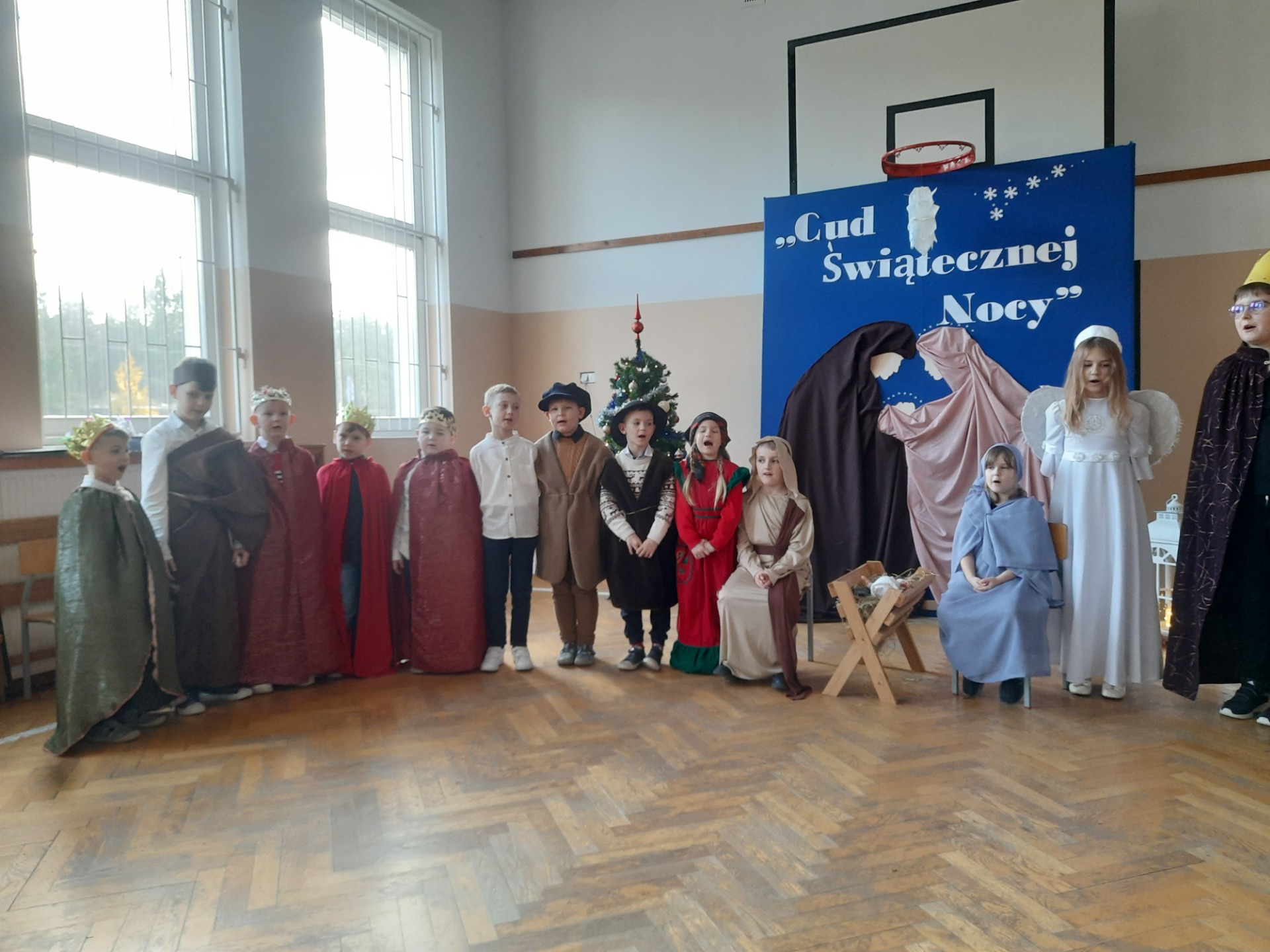 W dniu dzisiejszym hala sportowa wypełniła się ciepłem, wzruszeniem i radosnym oczekiwaniem🎄. Jasełka "CUD ŚWIĄTECZNEJ NOCY"❤️ były niezwykłym wydarzeniem, w którym szczególną rolę odegrali najmłodsi uczniowie naszej szkoły. Z ogromnym zaangażowaniem, odwagą i dziecięcą radością wcieli się oni w swoje role, prezentując historię Bożego Narodzenia w sposób pełen szczerości i autentycznych emocji. Ich śpiew i recytacje zachwyciły publiczność i zostały nagrodzone gromkimi brawami. Mali aktorzy udowodnili, że nawet najmniejsze serca potrafią przekazać wielkie wartości - miłość, dobro i nadzieję. Po części artystycznej odbyła się uroczysta wigilia, która stała się okazją do wspólnego przeżywania świątecznej atmosfery, dzielenia się opłatkiem, rozmów i integracji całej społeczności szkolnej. Pragniemy złożyć serdeczne podziękowania RODZICOM za ogromne zaangażowanie w przygotowanie tego wyjątkowego spotkania - za pyszne potrawy, świąteczny wystrój oraz stworzenie ciepłej, rodzinnej atmosfery. Podziękowania kierujemy również do Pań Radnych za słodkości i upominki dla naszych uczniów. Dzięki wspólnemu wysiłkowi uczniów, nauczycieli i rodziców uroczystość "CUD ŚWIĄTECZNEJ NOCY" na długo pozostanie w naszej pamięci, jako piękne i wzruszające wydarzenie, które przypomniało nam o prawdziwym sensie Świąt Bożego Narodzenia.