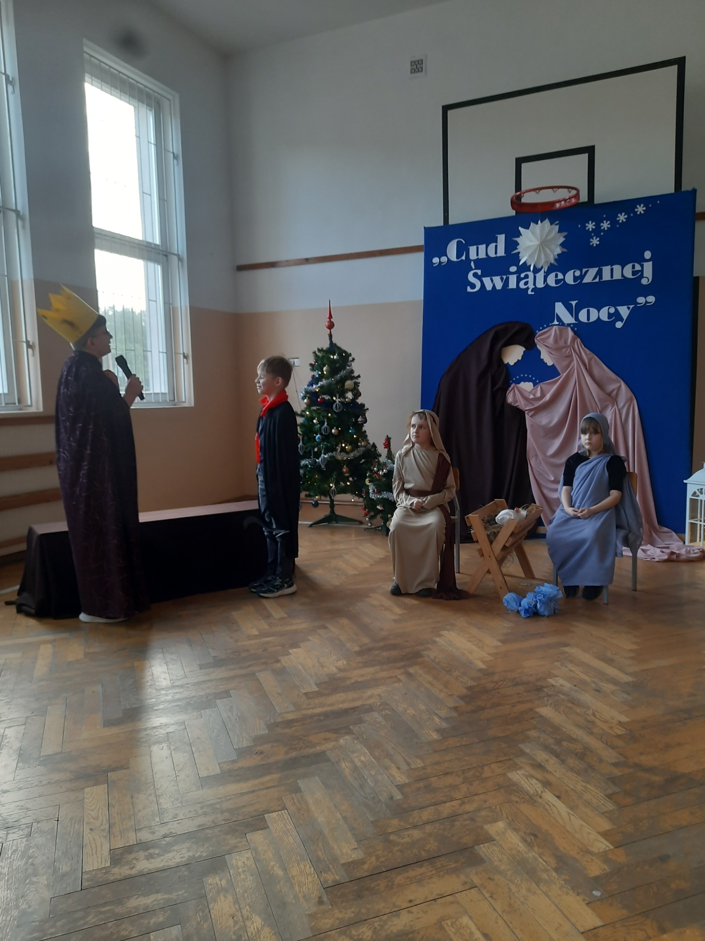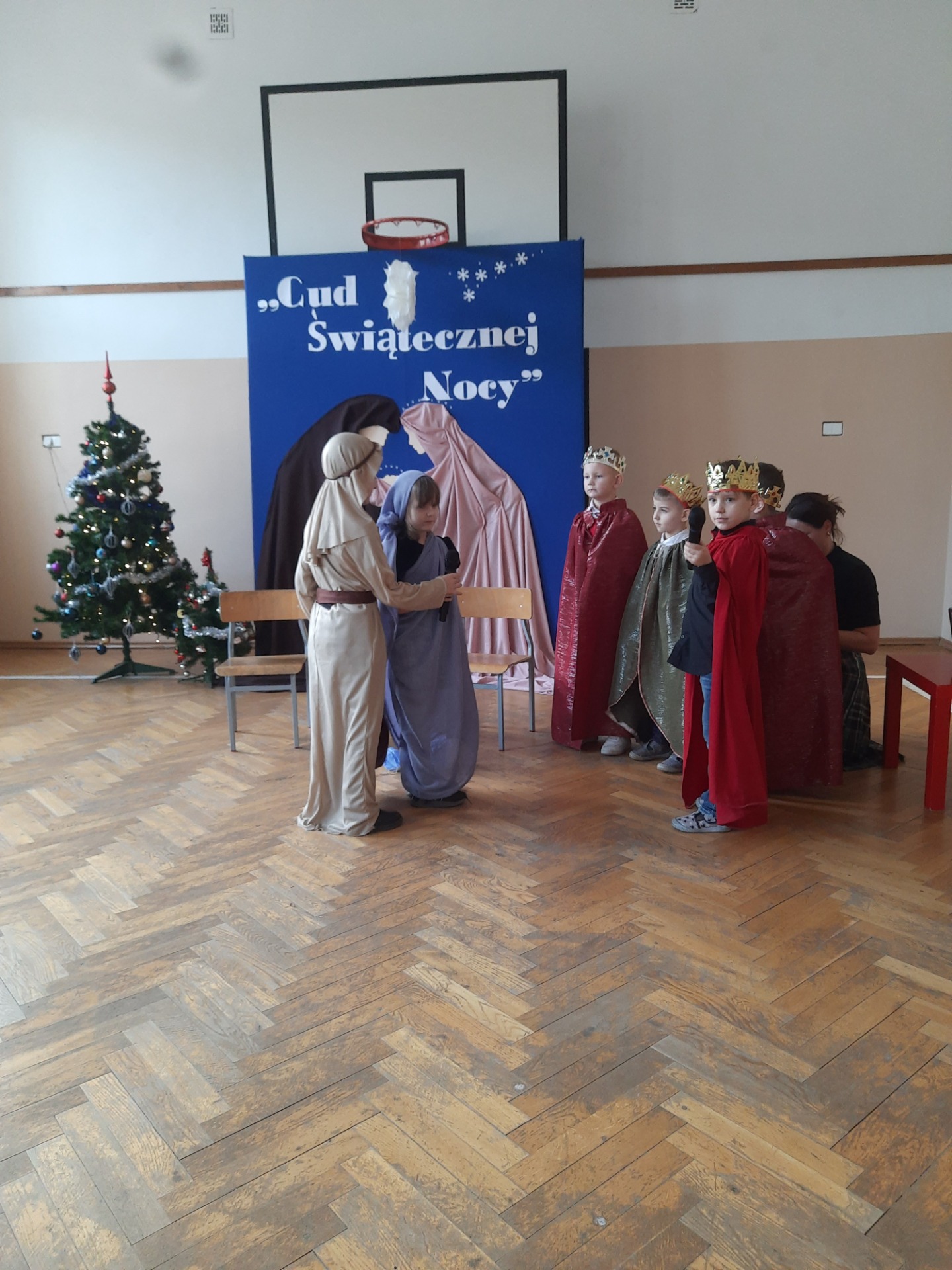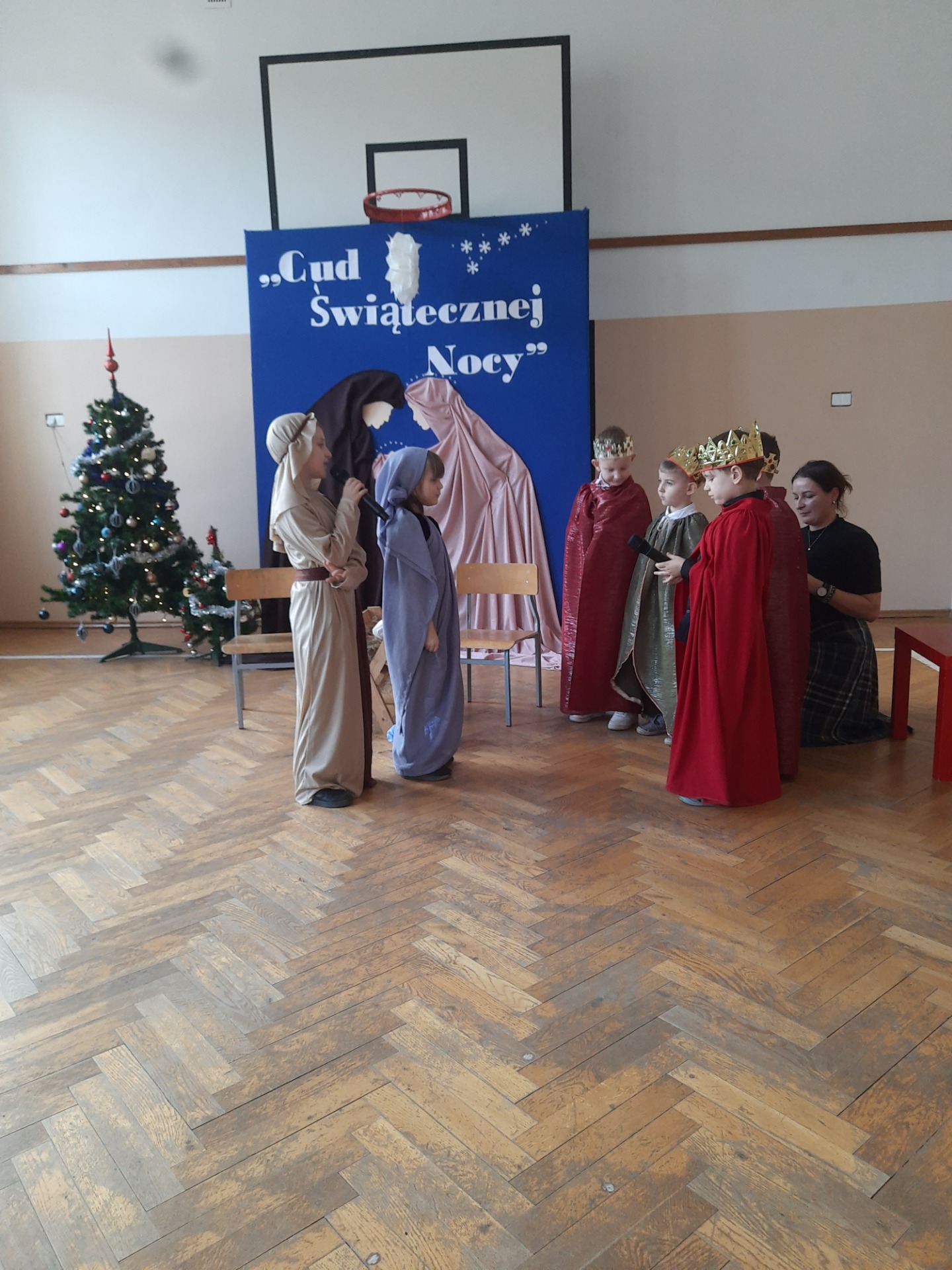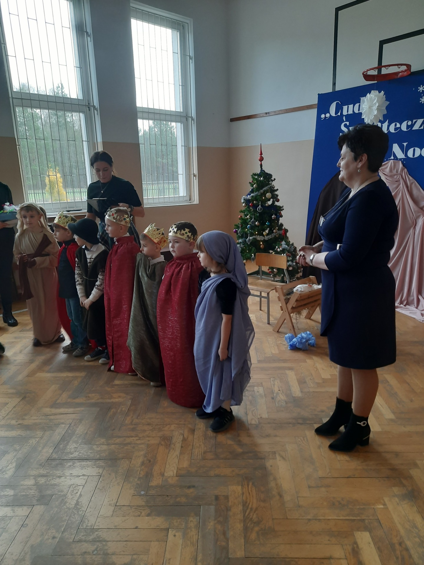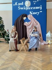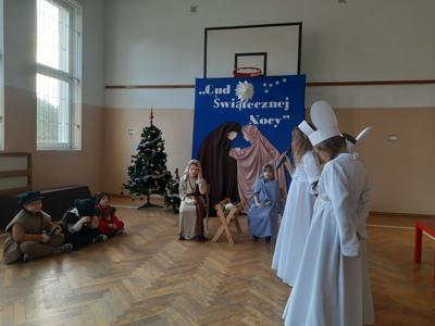 W dniu dzisiejszym hala sportowa wypełniła się ciepłem, wzruszeniem i radosnym oczekiwaniem🎄. Jasełka "CUD ŚWIĄTECZNEJ NOCY"❤️ były niezwykłym wydarzeniem, w którym szczególną rolę odegrali najmłodsi uczniowie naszej szkoły. Z ogromnym zaangażowaniem, odwagą i dziecięcą radością wcieli się oni w swoje role, prezentując historię Bożego Narodzenia w sposób pełen szczerości i autentycznych emocji. Ich śpiew i recytacje zachwyciły publiczność i zostały nagrodzone gromkimi brawami. Mali aktorzy udowodnili, że nawet najmniejsze serca potrafią przekazać wielkie wartości - miłość, dobro i nadzieję. Po części artystycznej odbyła się uroczysta wigilia, która stała się okazją do wspólnego przeżywania świątecznej atmosfery, dzielenia się opłatkiem, rozmów i integracji całej społeczności szkolnej. Pragniemy złożyć serdeczne podziękowania RODZICOM za ogromne zaangażowanie w przygotowanie tego wyjątkowego spotkania - za pyszne potrawy, świąteczny wystrój oraz stworzenie ciepłej, rodzinnej atmosfery. Podziękowania kierujemy również do Pań Radnych za słodkości i upominki dla naszych uczniów. Dzięki wspólnemu wysiłkowi uczniów, nauczycieli i rodziców uroczystość "CUD ŚWIĄTECZNEJ NOCY" na długo pozostanie w naszej pamięci, jako piękne i wzruszające wydarzenie, które przypomniało nam o prawdziwym sensie Świąt Bożego Narodzenia.