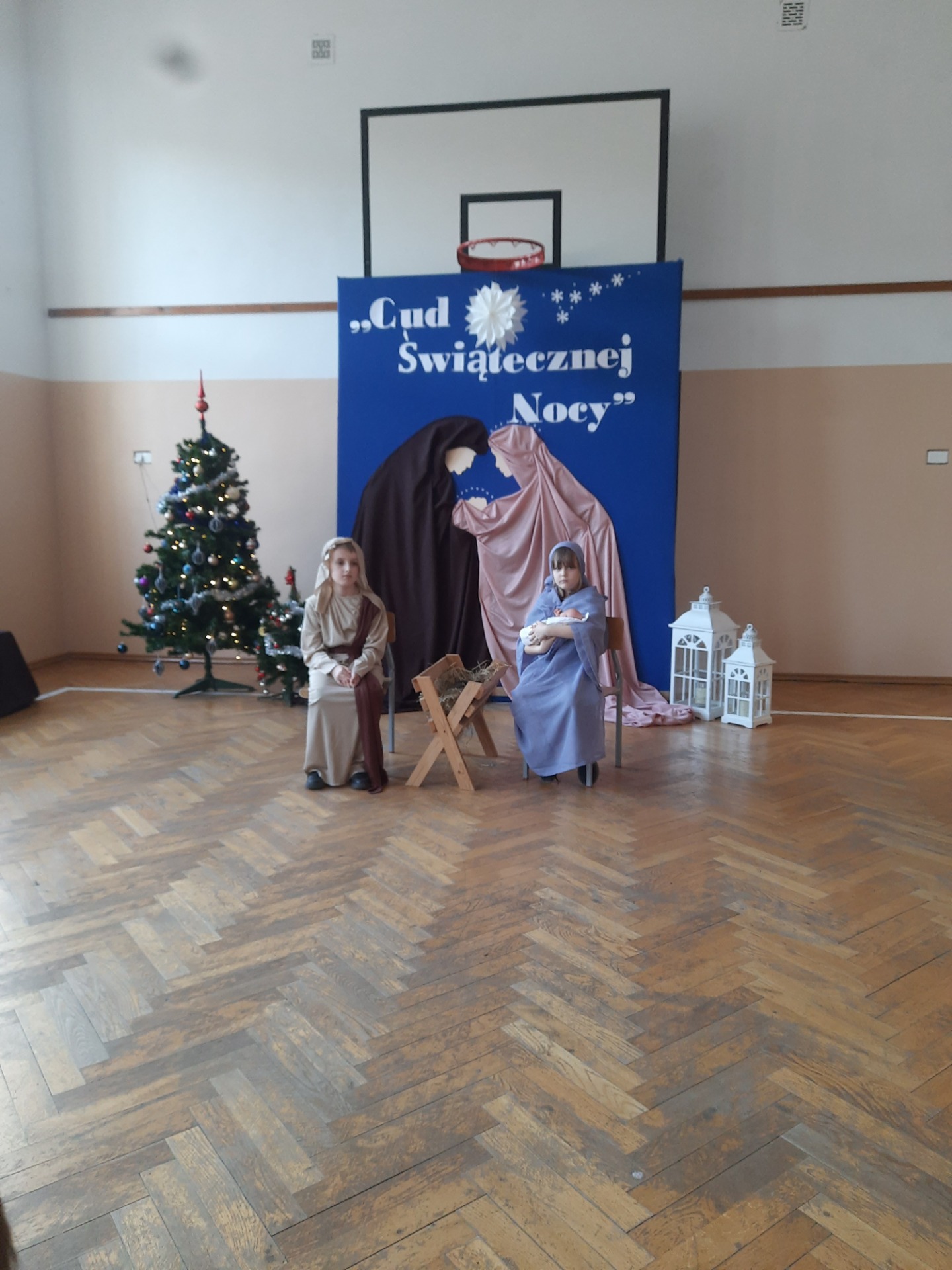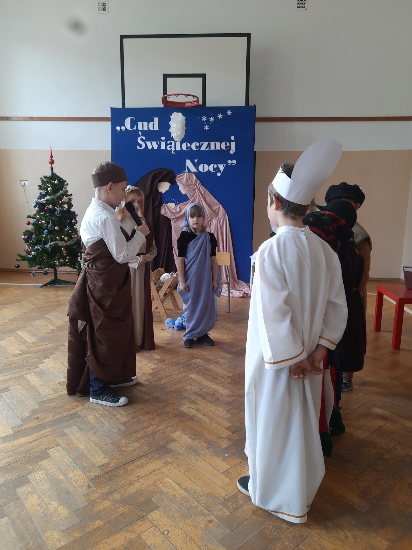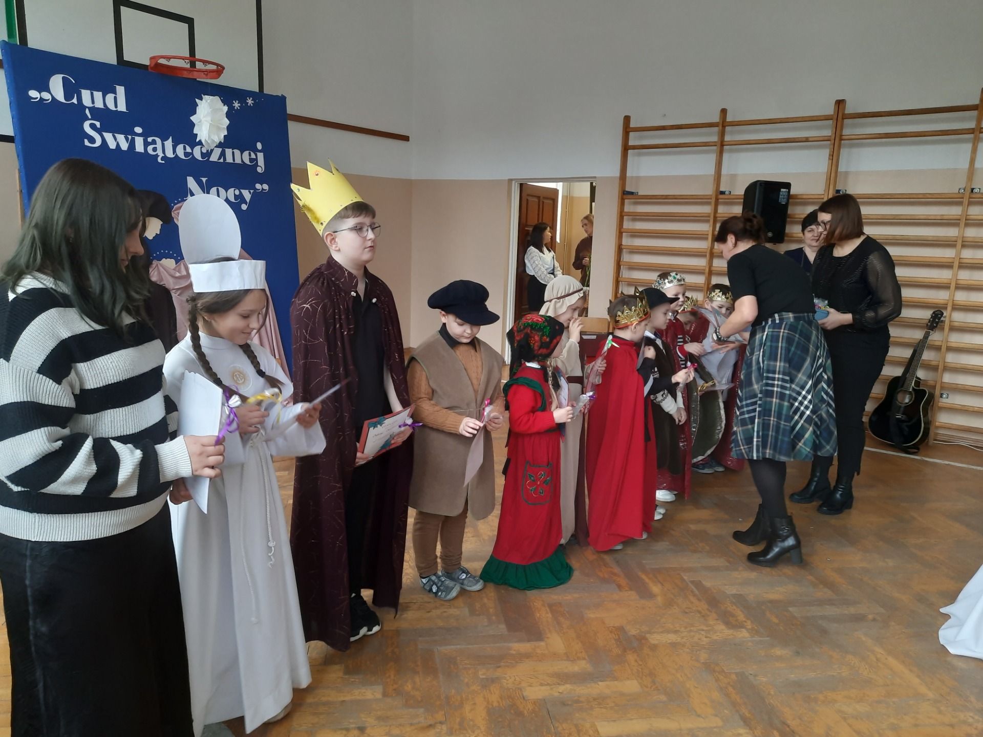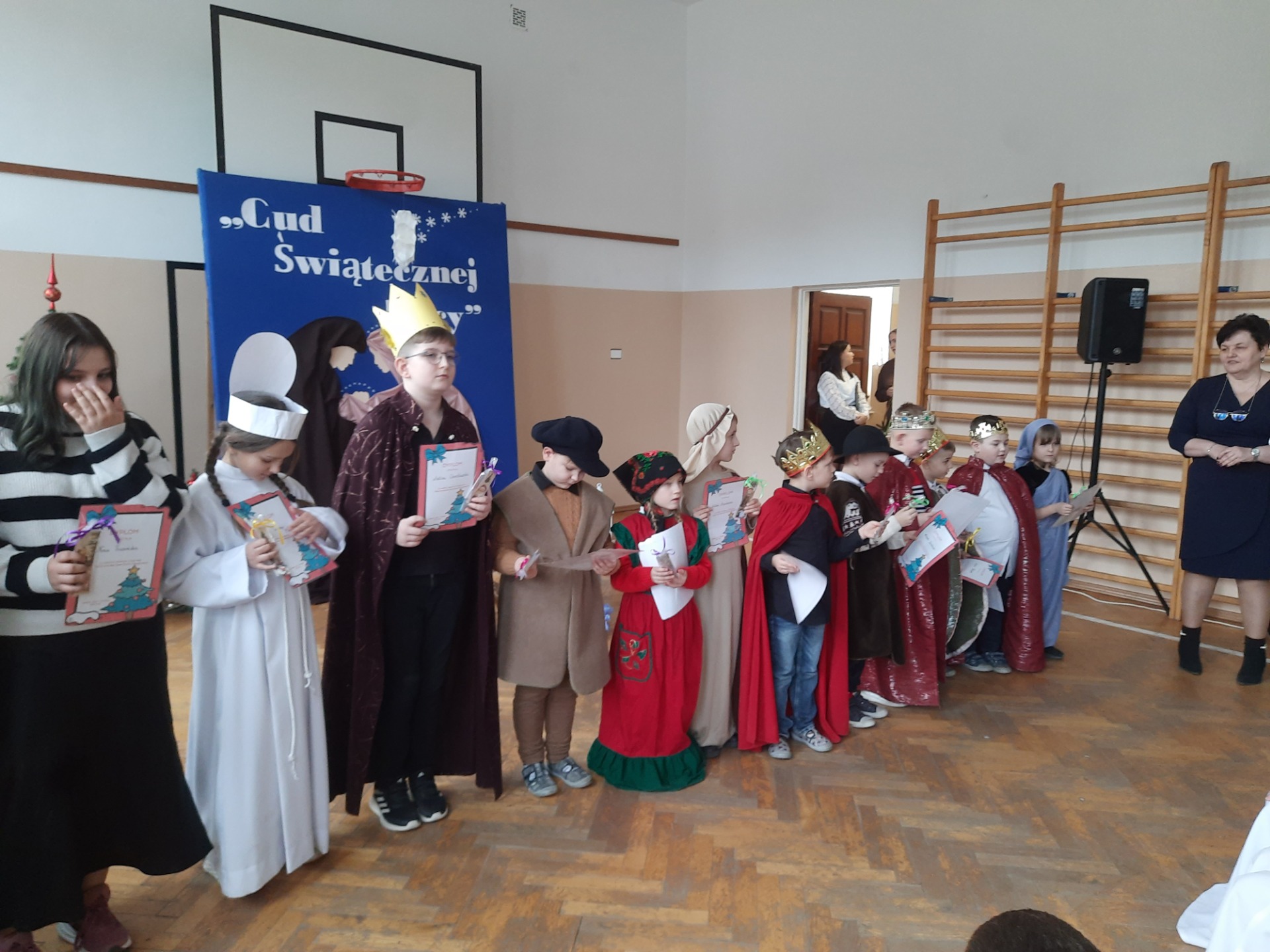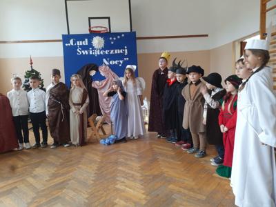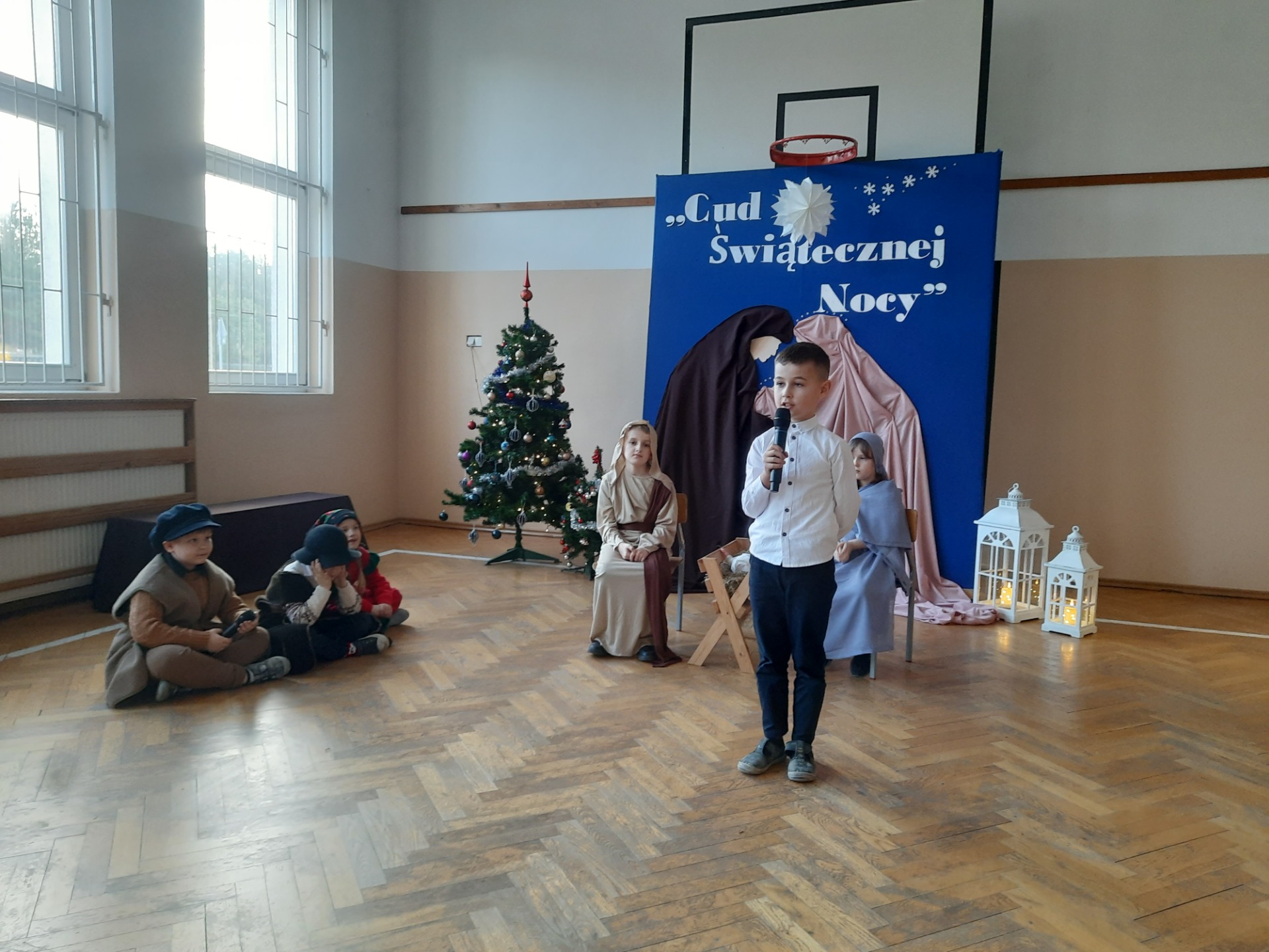 W dniu dzisiejszym hala sportowa wypełniła się ciepłem, wzruszeniem i radosnym oczekiwaniem🎄. Jasełka "CUD ŚWIĄTECZNEJ NOCY"❤️ były niezwykłym wydarzeniem, w którym szczególną rolę odegrali najmłodsi uczniowie naszej szkoły. Z ogromnym zaangażowaniem, odwagą i dziecięcą radością wcieli się oni w swoje role, prezentując historię Bożego Narodzenia w sposób pełen szczerości i autentycznych emocji. Ich śpiew i recytacje zachwyciły publiczność i zostały nagrodzone gromkimi brawami. Mali aktorzy udowodnili, że nawet najmniejsze serca potrafią przekazać wielkie wartości - miłość, dobro i nadzieję. Po części artystycznej odbyła się uroczysta wigilia, która stała się okazją do wspólnego przeżywania świątecznej atmosfery, dzielenia się opłatkiem, rozmów i integracji całej społeczności szkolnej. Pragniemy złożyć serdeczne podziękowania RODZICOM za ogromne zaangażowanie w przygotowanie tego wyjątkowego spotkania - za pyszne potrawy, świąteczny wystrój oraz stworzenie ciepłej, rodzinnej atmosfery. Podziękowania kierujemy również do Pań Radnych za słodkości i upominki dla naszych uczniów. Dzięki wspólnemu wysiłkowi uczniów, nauczycieli i rodziców uroczystość "CUD ŚWIĄTECZNEJ NOCY" na długo pozostanie w naszej pamięci, jako piękne i wzruszające wydarzenie, które przypomniało nam o prawdziwym sensie Świąt Bożego Narodzenia.
